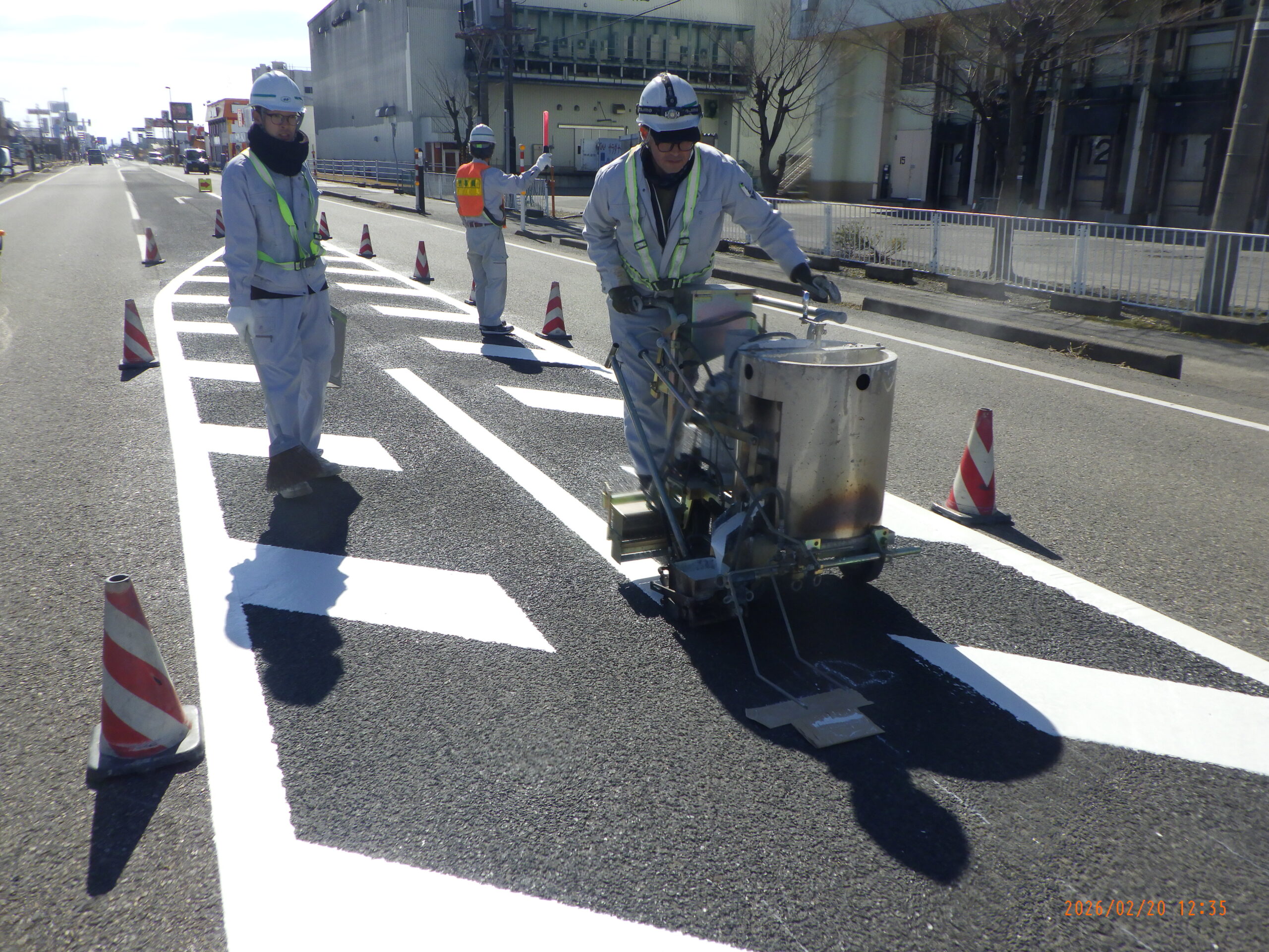 私たちの仕事は、道路のライン、横断歩道などの標示工事。道路の案内標識、止まれなどの標識工事。ガードレール、防護柵、カーブミラーなどの各交通安全施設設置工事をしています。